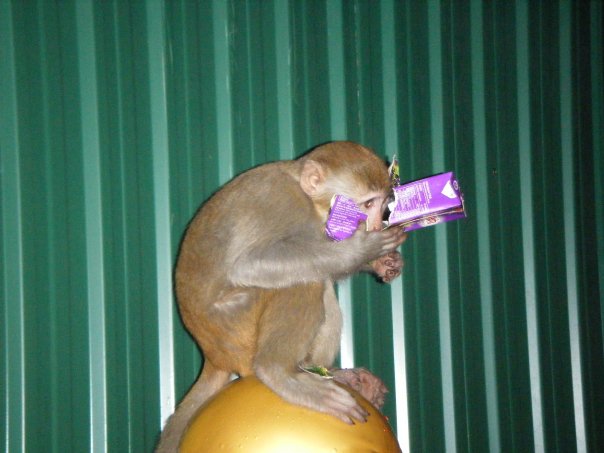 It was definitely worth the trip, and as we were coming back down from the top of the hill, we encountered a group of wild monkeys! Two adults and two babies were jumping from Buddha to Buddha, running along the path in front of us, tearing open juice boxes that had been offered up as gifts earlier in the day and doing what monkeys do. My friend told me that monkeys there are like squirrels to us in the US; just commonplace. For us foreigners though it was amazing, and we could get quite close to them before they would run up a tree or out of reach! That alone, was worth making the steep hike up the Buddha trails.
