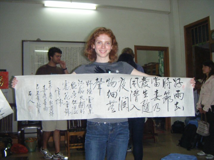 After being led around for a good three hours, we were taken to another restaurant and served more enormous quantities of food for dinner (even though we were all still full from lunch – noticing a pattern here?), then we went to Mr. Mai’s house, which is huge by Chinese standards and asked him more questions. I had been told that he was an expert calligrapher so I asked if he would give us a demonstration and then things got fun. He brought out two practice calligraphy mats that were special because you only have to use water, but it shows up like black ink on the mats then disappears again as the water dries. Well after he impressed us thoroughly with that magic trick, everyone else wanted to try – the local students, the exchange students, my professor, the people along for the ride from the research branch – everyone. As we were all amusing ourselves with this, Mr. Mai went back to his study and whipped off about 15 copies of different poems and other famous Chinese works and just gave them to us! He was absolutely one the sweetest old men I’ve ever met, and then we asked if he could write our names phonetically in Chinese characters on the calligraphy he gave us. My name means “Wearing Jewelry” in Chinese characters.