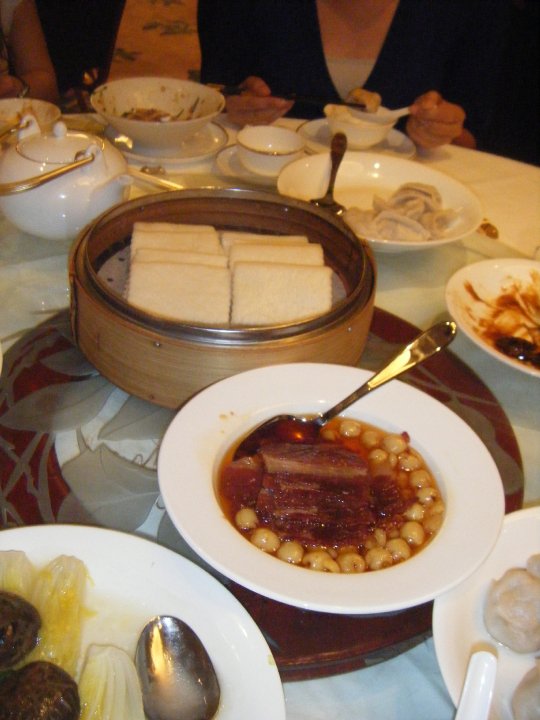 That evening, my friend Jen’s boyfriend came to Hong Kong because he would be working for two months in the Singapore branch of Deutsche Bank. Jen had organized a really nice dinner reservation at this restaurant in Tsim Sha Tsui called Peking Garden at 9, and a group of eight of us went. One of our friends, who grew up north of Beijing before moving to Canada when he was 11, did the majority of the ordering (along with a little help from my Frommer’s Hong Kong book) for the whole group. I have to say, all that we ordered was delicious; we had house made noodles with peanut satay sauce, mushrooms, prawns in rice wine, three kinds of dumplings, mutton and noodles (I loved mutton at this point, by the way), steamed vegetables, marinated beef, thinly sliced pork in honey sauce with lotus that you put into little flat folded pieces of dough, and these incredibly fatty pieces of pork cooked in a sweet sauce inside little pots (the actual name may be slow braised pork in a clay pot, but I can’t be totally sure), the pork pieces were quite large but meant to be eaten in one huge bite (very attractive to watch, I can tell you) and were indescribably tasty (because they were so unhealthy probably).