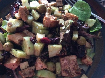 - Chop up chicken or steak into bite sized chunks and add to salad.