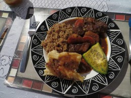 On Friday morning, Sean’s mom brought home fresh doubles and aloo pies for breakfast – with slight pepper, of course. We’d both been craving these almost since the day we arrived, but doubles are really only a breakfast food in Trinidad so many of the shops or carts selling them were closed by the time we were out and about and ready for food. Luckily, I really got my fill that day. The pepper was a little heavy for my tastes (i.e. my tongue was slightly on fire), but it hurt so good just the same. The aloo pie was also tasty as well – neither doubles nor aloo pie are pretty to look at, but damn they taste good!