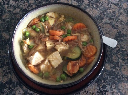 The recipe is quick to make, low-fat and it can be made with cooked or uncooked chicken, depending on what you have on hand. The same thing goes for the veggies – use what you’ve got in the kitchen or what sounds most appealing. Anyway, here’s the recipe for chicken soup, guaranteed to improve even the worst cold sufferer.