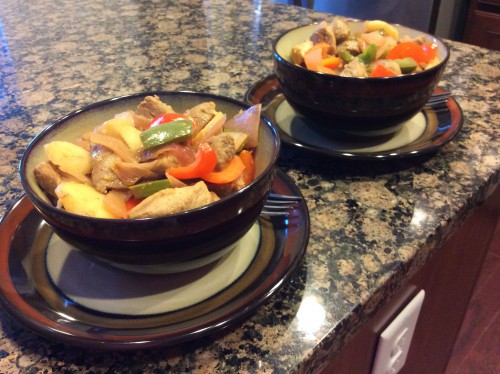 3. Now, prep the onion, peppers, water chestnuts and whatever other veggies you may choose. Cut the onion into chunks and slice the peppers into roughly uniform pieces.