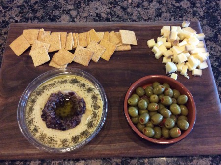 - Place all these elements on a large plate or cutting board or other decorative tray, placing cheese and olives near each other and veggies and crackers around hummus for easy dipping.