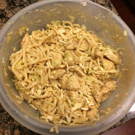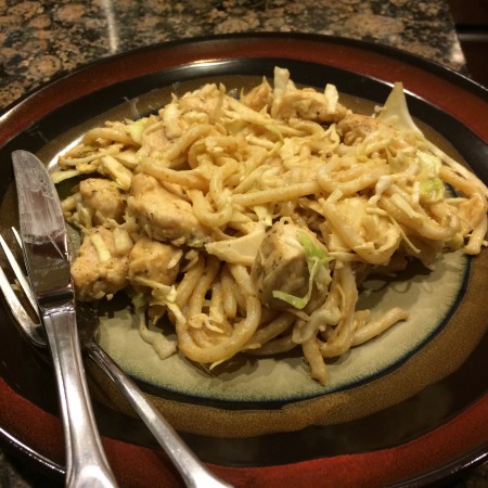 I made a few tweaks to the recipe for my tastes, bought the ingredients, took an hour to put it together after work one evening, and bam: a new recipe I’m happy to share with you was born. The peanut taste’s not too strong, the noodles are big and chewy and the chicken and cabbage really make this a stick-to-your-ribs meal you’ll feel very full after eating.