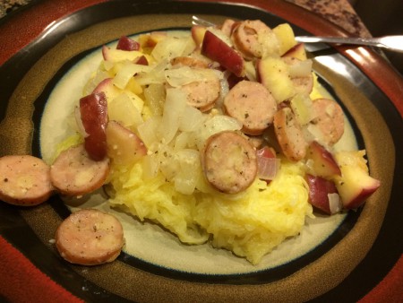 A couple of weeks back I bought a little spaghetti squash intending to stick to my ‘safe’ method of preparing it: a little salt, a little pepper, a little olive oil, and voila: easy side dish. However, then I came across a recipe making the spaghetti squash the main player in the recipe instead of just side: a delicious (and unusual) cook up of apple, onion and sausage piled high on roasted spaghetti squash. It sounded really good on its own, but I decided to healthy it up a little bit with some tweaks of my own: remove the butter, use low-fat chicken sausage and add some extra creamy flavor with Laughing Cow Light Cheese wedges.