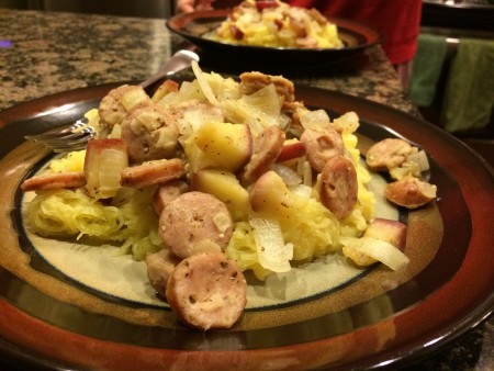 It’s been a while since I’ve written a post that’s paleo-friendly and low carb, and I didn’t do it on purpose, but it just sort of happened that way. I figure, with the holidays (and all their temptations) upon us, who couldn’t benefit from a great, filling meal that’s a little more figure-friendly. Once you dig into my chicken sausage and apple spaghetti squash pasta, you won’t think it’s low-calorie, it tastes so indulgent.
