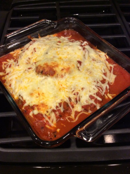 Innovative cook that I am, I took a few shortcuts in the kitchen to make it quicker, easier and better suited to my boyfriend Sean and I. The idea’s the same, the execution is just a little different. Trust me when I say this, though: this chicken parmesan is going to fill you up right. It’s cheesy, it’s saucy, it’s rich and served over spaghetti it’s magnifico!