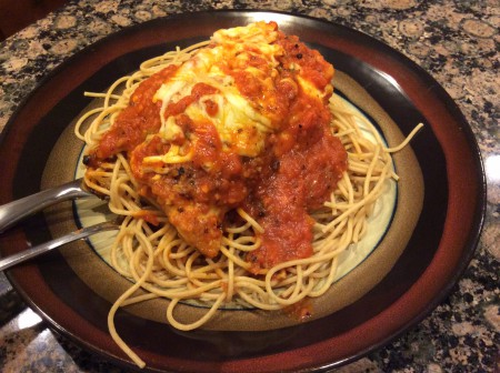 - Serve the chicken breasts over a helping of spaghetti and spoon extra marinara sauce from the baking dish onto the pasta.