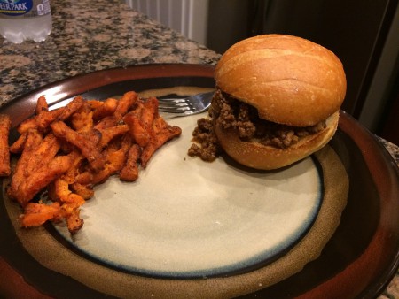 - Place buns on a plate and divide beef evenly between them. Serve with side dish of choice (I went with sweet potato fries this time).