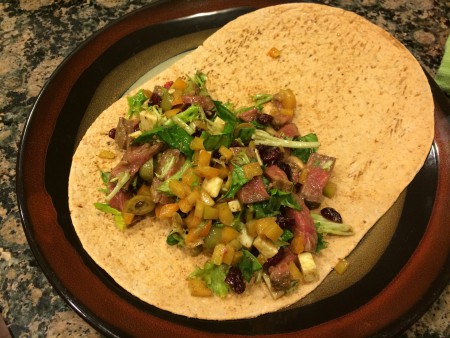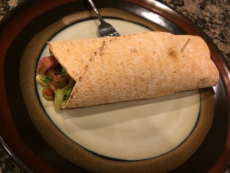 Last week, though, we had a small weather warm up, Publix was having a sale on bone-in rib eye steaks, and we gave in a bought a couple. The first, Sean grilled up and we split down the middle with just a side salad to go with it (so good!), but the second I refused to demolish in just one dinner. Instead, I figured out how to stretch it (and spare myself some fat calories per meal – rib eye can still be a bit fatty), by combining the steak with our favorite salad elements and wrapping it all up together in a wrap. Not only is this combination super delicious, but it’s a great use for any leftover steak or salad you might have (especially if they won’t go far enough on its own), it doesn’t need to be heated up and it’s a quick fix for dinner during the week. Enjoy!