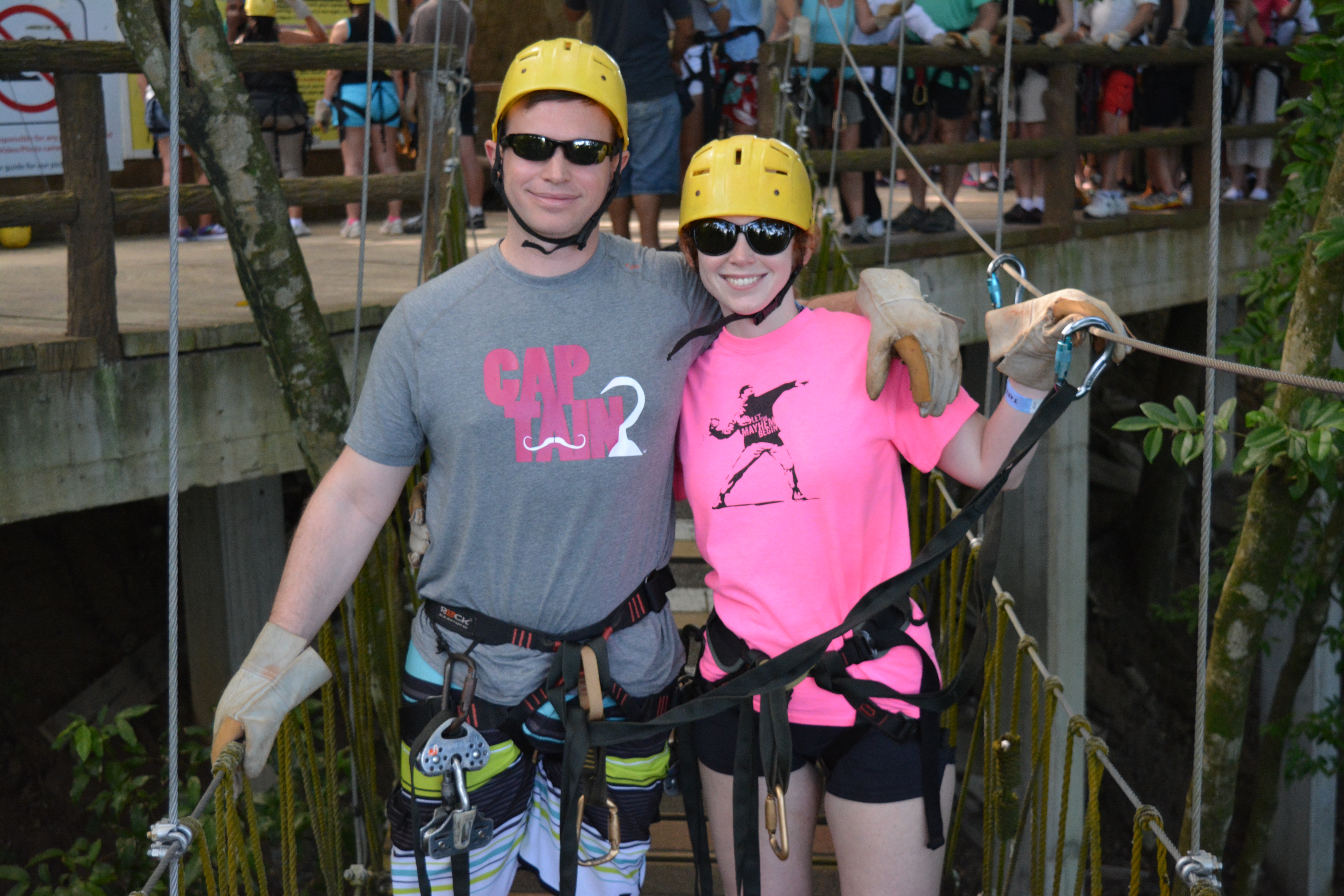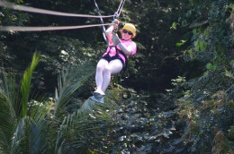 The look and feel of Roatan reminded me a lot of my visits to Trinidad, and it was a gorgeous, lush island and jungle that we drove into before coming to a halt near the Monkey Trail, our zipline purveyor. After a short do’s and don’ts from the zipline manager, we were all suited up in harnesses, helmets and gloves and sent whizzing off into the trees. Sean and I got to be the first two down, and it was such a blast! I had so much fun flying along, seeing the gorgeous views around me, it was awesome!!
